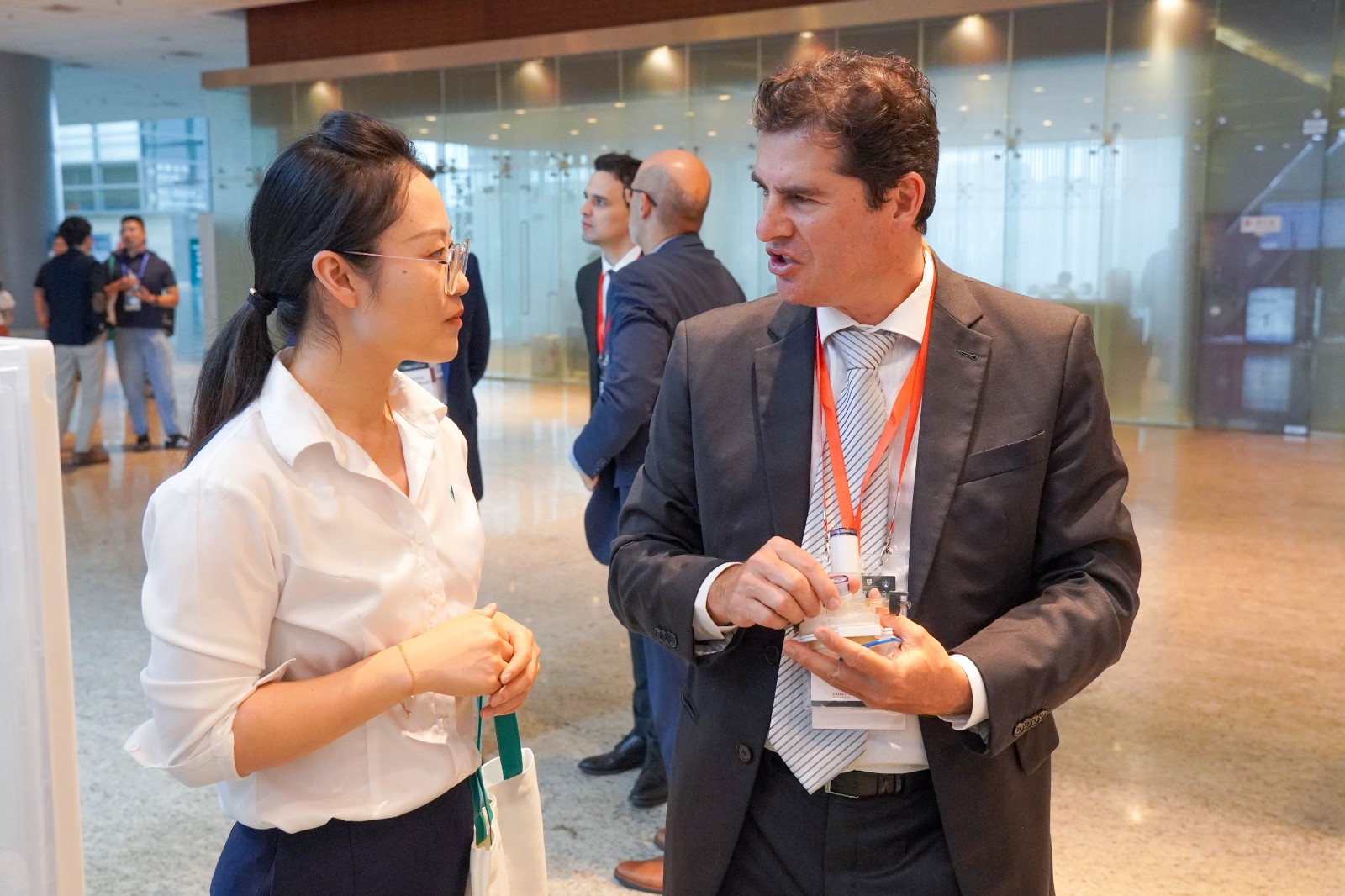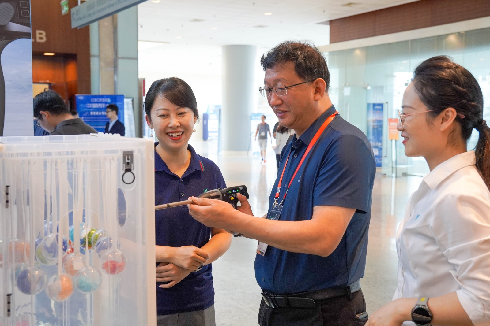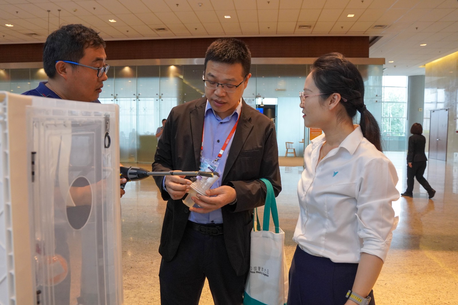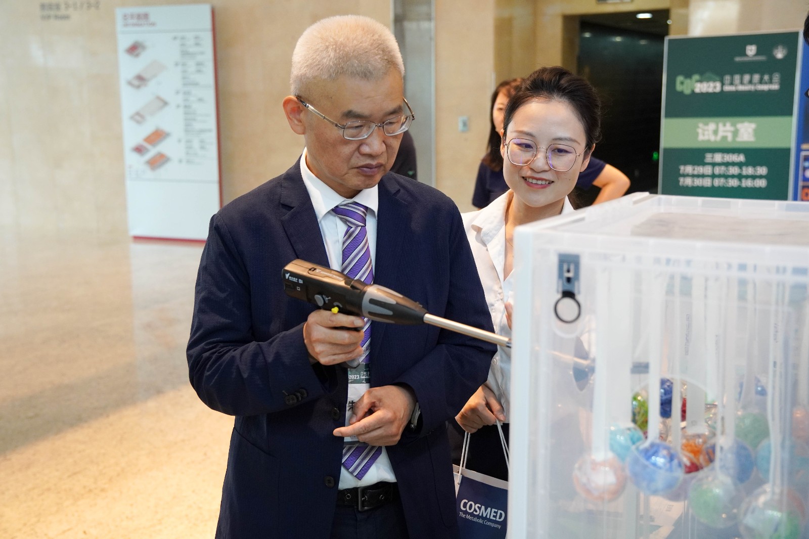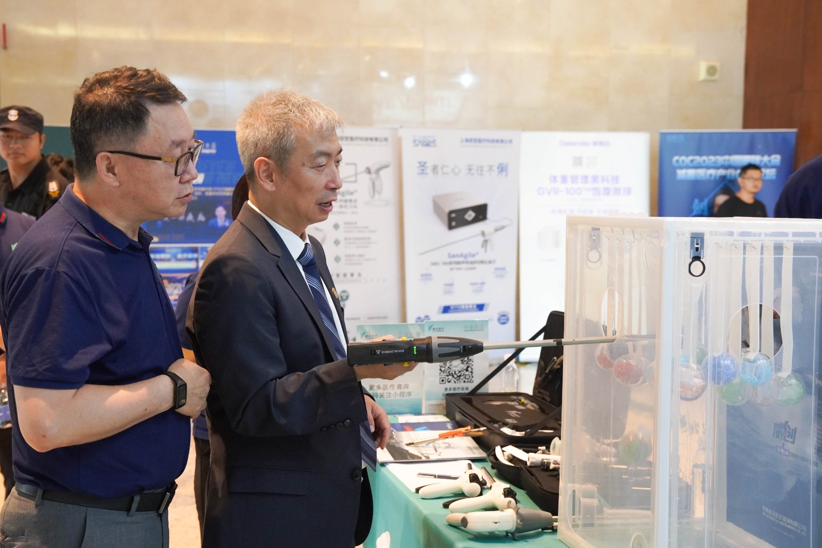 威克医疗单孔多通道系列产品在展台上吸引了众多专家的目光,纷纷上手体验。