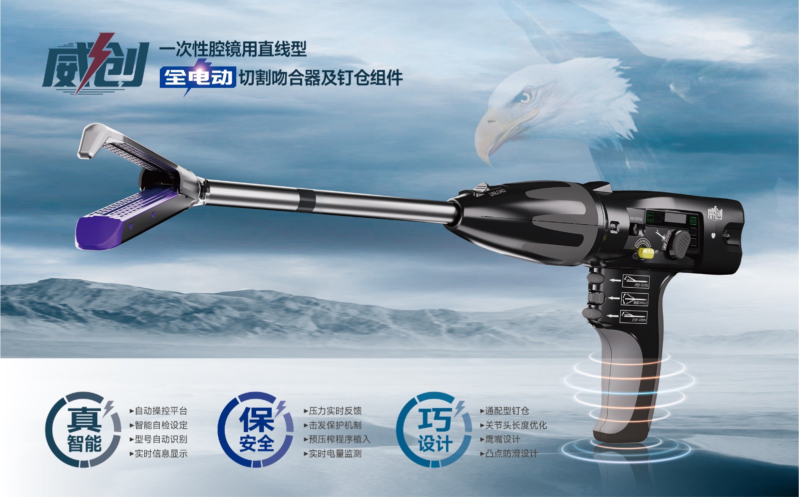 “威创”是一款全球独创的具有自主知识产权的全电动智能腔镜切割吻合器。它搭载了全新智能芯片,手术时可以实时反馈击发阻力,使术者的操作更加游刃有余。同时,“威创”还具备智能自检设定、型号自动识别和实时信息显示等功能,为术者带来了全新的人机交互体验。在安全性方面,“威创”具备击发保护机制和预压榨程序植入等卓越的安全保护机制,这使得切割吻合和成钉效果更加平稳,并大大提高了手术的安全性和效率。